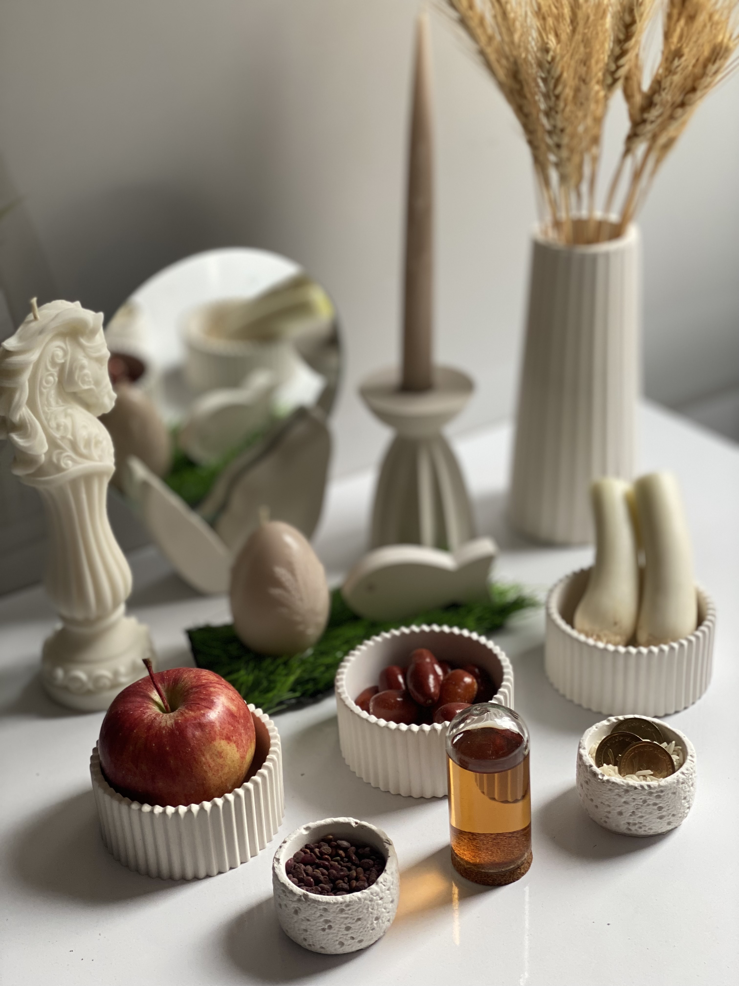 قیمت ست بدون احتساب شمع اسب لاریس،شمع تخم مرغ و شیشه سرکه حساب شده،ست شامل(گلدان شیاردار،۲عدد کاسه تکسچر کوچک،۳عدد کاسه شیاردار،ماهی،شمعدان،شمع قلمی،پایه آینه و آینه)