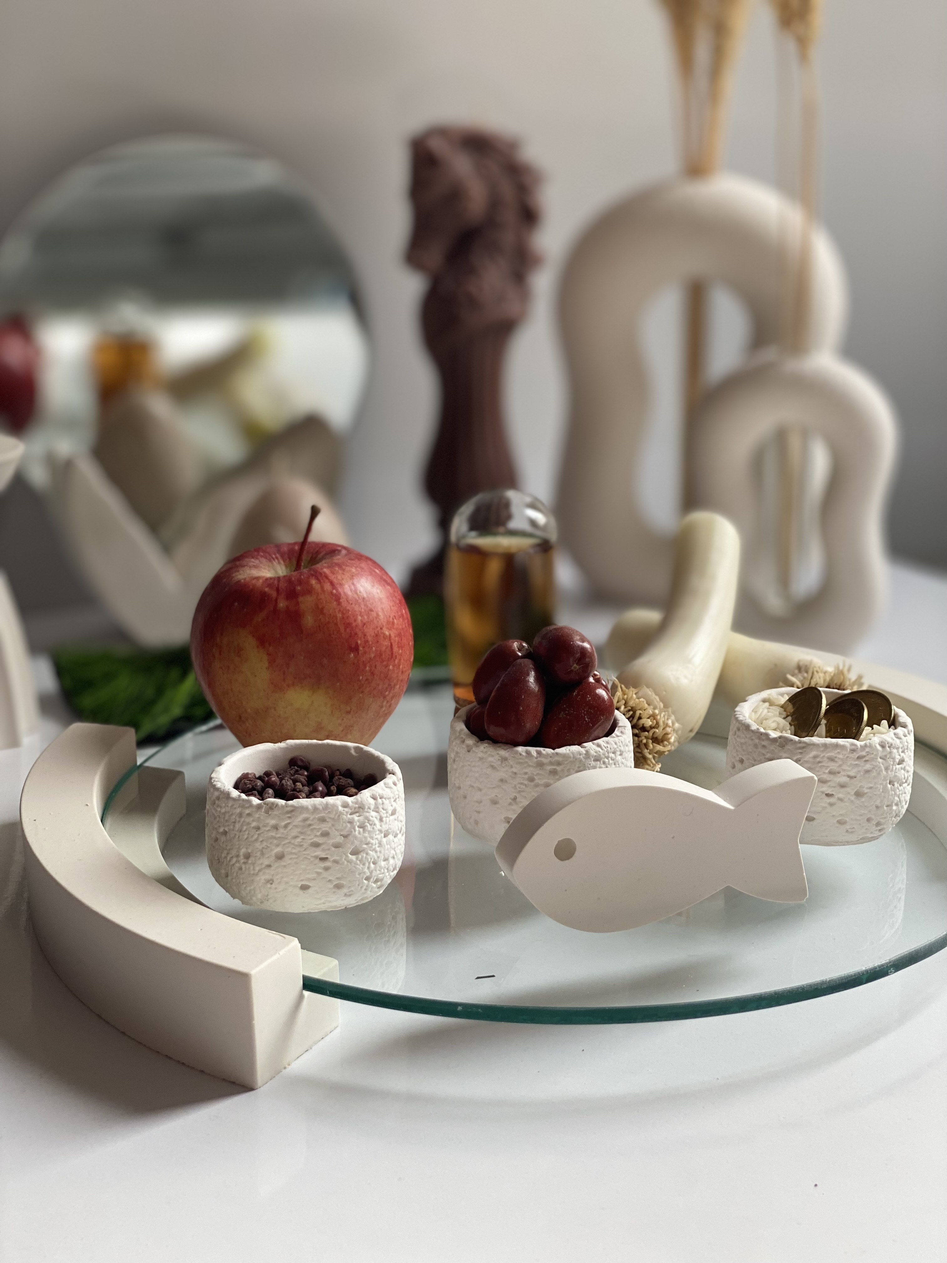 قیمت ست بدون احتساب شمع اسب لاریس،شمع تخم مرغ و شیشه سرکه حساب شده،ست شامل(ست گلجا تکسچر، ۳عدد کاسه تکسچر کوچک، استند، ماهی،شمعدان،شمع قلمی،پایه آینه و آینه)